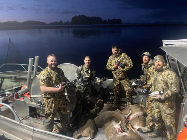 Once the group decides what animals will be targeted for the day, the crew will get you ashore with snacks or a sack lunch where you will spend the day hunting and pursuing the animals you choose on your own.  Hunters can have up to 4 Sitka blacktail tags, a black bear tag, and a small game license which covers smaller predators (coyote/fox) and waterfowl.  Game can be cleaned in the field or processed back on the boat where equipment and facilities are available.  Fishing will likely also be available during moves and around hunting activities depending on group preference.
